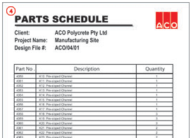ACO SchedulerACO has written a proprietary software program, ‘Scheduler’, that shows trench drain runs in profile. The program automatically plots each run showing positions of accessories, outlets, junctions, etc. It automatically calculates a ‘Bill of Materials’ for each run and totals multiple runs to ensure the correct amount of parts and pieces are ordered. ‘Scheduler’ plots are particularly useful for installers. Results (CAD) provided are: